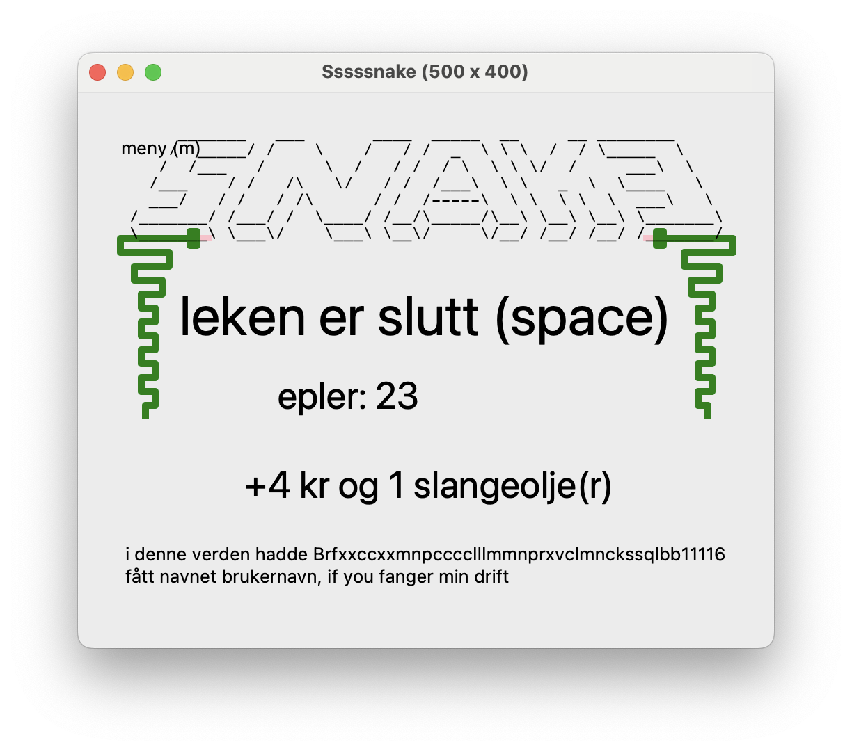 Det var veldig mange gode innleveringer for lab 5, og mange flere enn dem som vises her ble nominert som kandidater til høstens beste slangespill. Her er et lite utvalg av de nominerte: